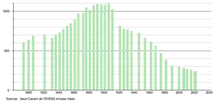 L'évolution du nombre d'habitants est connue à travers les recensements de la population effectués dans la commune depuis 1793. Pour les communes de moins de 10 000 habitants, une enquête de recensement portant sur toute la population est réalisée tous les cinq ans, les populations légales des années intermédiaires étant quant à elles estimées par interpolation ou extrapolation[50]. Pour la commune, le premier recensement exhaustif entrant dans le cadre du nouveau dispositif a été réalisé en 2005[51].