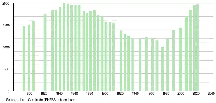 L'évolution du nombre d'habitants est connue à travers les recensements de la population effectués dans la commune depuis 1793. Pour les communes de moins de 10 000 habitants, une enquête de recensement portant sur toute la population est réalisée tous les cinq ans, les populations légales des années intermédiaires étant quant à elles estimées par interpolation ou extrapolation[26]. Pour la commune, le premier recensement exhaustif entrant dans le cadre du nouveau dispositif a été réalisé en 2007[27].