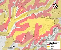 Les mouvements de terrains susceptibles de se produire sur la commune sont des mouvements de terrains, notamment des tassements différentiels[18]. Le retrait-gonflement des sols argileux est susceptible d'engendrer des dommages importants aux bâtiments en cas d’alternance de périodes de sécheresse et de pluie[19]. 86,7 % de la superficie communale est en aléa moyen ou fort (54,9 % au niveau départemental et 48,5 % au niveau national)[Carte 2]. Depuis le , en application de la loi ELAN, différentes contraintes s'imposent aux vendeurs, maîtres d'ouvrages ou constructeurs de biens situés dans une zone classée en aléa moyen ou fort[Note 3],[20].
