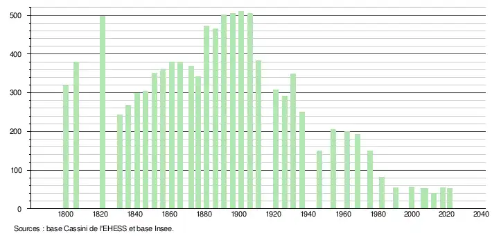 L'évolution du nombre d'habitants est connue à travers les recensements de la population effectués dans la commune depuis 1800. Pour les communes de moins de 10 000 habitants, une enquête de recensement portant sur toute la population est réalisée tous les cinq ans, les populations légales des années intermédiaires étant quant à elles estimées par interpolation ou extrapolation[20]. Pour la commune, le premier recensement exhaustif entrant dans le cadre du nouveau dispositif a été réalisé en 2007[21].