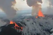 Dans la journée du , une série d'environ un millier de séismes remet le volcan sous surveillance[11],[12]. Ces séismes, révélateurs de mouvements dans la chambre magmatique, induisent un risque important d'éruption nécessitant une surveillance renforcée et la fermeture des zones naturelles environnantes[11],[13]. Le début de l'éruption (en) est confirmé le par l'ouverture d'une fissure dans le Holuhraun, au nord du Dyngjujökull[14],[15], avec émission de panaches de fumée et d'une intense lumière[11]. Dès les premières heures de la journée, l'Institut météorologique islandais, chargé de la surveillance de l'activité volcanique, a élevé le niveau d'alerte au niveau maximal (rouge) avant de le baisser à 13 h 0 à orange[11]. Rapidement, de petits cônes de scories s'édifient autour des fontaines de lave, le long de la fissure ; le principal d'entre eux est appelé Baugur[11]. La coulée de lave qui se forme à partir de ces fontaines se dirige vers le nord-est en longeant la rive gauche de la Jökulsá á Fjöllum[11]. Continuant sa progression, elle se jette dans le lit du fleuve à partir du et force le cours d'eau à réduire sa largeur et à se déplacer vers l'est ; de nombreux petits panaches de vapeur d'eau nés de la vaporisation de l'eau de la Jökulsá á Fjöllum au contact de la lave s'élèvent au-dessus du front de la coulée[11]. L'éruption se termine le [11] ; le volume de 1,4 km3 de lave s'étend sur 85 km2 de superficie pour une épaisseur moyenne de 14 mètres et maximale d'environ 40 mètres, le cratère principal s'élevant plus haut que l'Hallgrímskirkja, l'église la plus connue du pays de 75 mètres de hauteur[16].