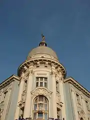 La façade d'angle est dominée par un dôme surmonté d'une statue dorée de Mercure, le dieu du commerce, avec des chaussures ailées et portant un pétase et un caducée, œuvre du sculpteur Đorđe Jovanović[3] ; pour cette raison, pour préciser une direction, les vieux habitants de Novi Sad se réfèrent à lui en indiquant « l'angle de la rue avec l'homme d'or »[5]. À l'angle des rues Grčkoškolska et Miletićeva, le portail possède des vantaux en fer forgé avec des motifs rocaille stylisés et portant les initiales CKZ (Centralni kreditni zavod) en ligature ; l'entrée est encadrée de hauts vases de pierre et de colonnes supportant une balustrade épousant la courbe de la façade d'angle ; après la balustrade, des colonnes engagées aux chapiteaux composites, soulignent la verticalité de l'ensemble, déjà mis en valeur par le couronnement du dôme[2].
