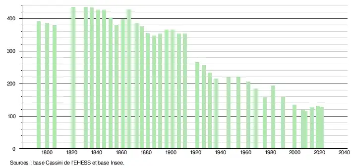 L'évolution du nombre d'habitants est connue à travers les recensements de la population effectués dans la commune depuis 1793. Pour les communes de moins de 10 000 habitants, une enquête de recensement portant sur toute la population est réalisée tous les cinq ans, les populations légales des années intermédiaires étant quant à elles estimées par interpolation ou extrapolation[28]. Pour la commune, le premier recensement exhaustif entrant dans le cadre du nouveau dispositif a été réalisé en 2008[29].