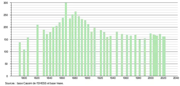 L'évolution du nombre d'habitants est connue à travers les recensements de la population effectués dans la commune depuis 1793. Pour les communes de moins de 10 000 habitants, une enquête de recensement portant sur toute la population est réalisée tous les cinq ans, les populations légales des années intermédiaires étant quant à elles estimées par interpolation ou extrapolation[15]. Pour la commune, le premier recensement exhaustif entrant dans le cadre du nouveau dispositif a été réalisé en 2004[16].