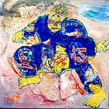 - « Ces œuvres aux faux airs primitifs (mais ni naïves ni ludiques) se subdivisent en bandes vaguement horizontales ou en parcelles géométriques aux contours irréguliers racontant chacun une histoire animée, souvent fantasmatique. Ces toiles éclatées, au style très personnel, peuvent intriguer, dérouter, mais ne sauraient laisser indifférent. » - Marc Hérissé[35]