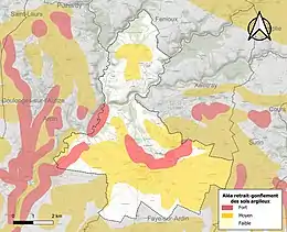 Les mouvements de terrains susceptibles de se produire sur la commune sont des tassements différentiels[17]. Le retrait-gonflement des sols argileux est susceptible d'engendrer des dommages importants aux bâtiments en cas d’alternance de périodes de sécheresse et de pluie[18]. 55,2 % de la superficie communale est en aléa moyen ou fort (54,9 % au niveau départemental et 48,5 % au niveau national)[Carte 2]. Depuis le , en application de la loi ELAN, différentes contraintes s'imposent aux vendeurs, maîtres d'ouvrages ou constructeurs de biens situés dans une zone classée en aléa moyen ou fort[Note 3],[19].