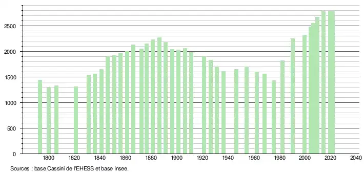L'évolution du nombre d'habitants est connue à travers les recensements de la population effectués dans la commune depuis 1793. Pour les communes de moins de 10 000 habitants, une enquête de recensement portant sur toute la population est réalisée tous les cinq ans, les populations légales des années intermédiaires étant quant à elles estimées par interpolation ou extrapolation[31]. Pour la commune, le premier recensement exhaustif entrant dans le cadre du nouveau dispositif a été réalisé en 2004[32].