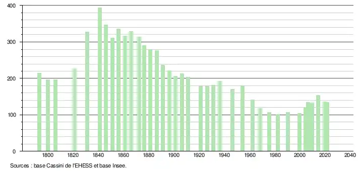 | L'évolution du nombre d'habitants est connue à travers les recensements de la population effectués dans la commune depuis 1793. Pour les communes de moins de 10 000 habitants, une enquête de recensement portant sur toute la population est réalisée tous les cinq ans, les populations légales des années intermédiaires étant quant à elles estimées par interpolation ou extrapolation[27]. Pour la commune, le premier recensement exhaustif entrant dans le cadre du nouveau dispositif a été réalisé en 2004[28]. En 2021, la commune comptait 134 habitants[Note 6], en diminution de 14,65 % par rapport à 2015 (Gers : +0,79 %, France hors Mayotte : +1,84 %). |