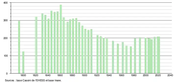 L'évolution du nombre d'habitants est connue à travers les recensements de la population effectués dans la commune depuis 1793. Pour les communes de moins de 10 000 habitants, une enquête de recensement portant sur toute la population est réalisée tous les cinq ans, les populations légales des années intermédiaires étant quant à elles estimées par interpolation ou extrapolation[42]. Pour la commune, le premier recensement exhaustif entrant dans le cadre du nouveau dispositif a été réalisé en 2004[43].