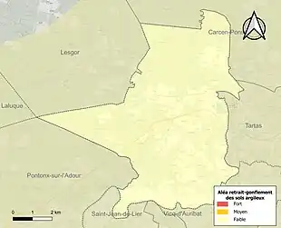 Le retrait-gonflement des sols argileux est susceptible d'engendrer des dommages importants aux bâtiments en cas d’alternance de périodes de sécheresse et de pluie. Aucune partie du territoire de la commune n'est en aléa moyen ou fort (19,2 % au niveau départemental et 48,5 % au niveau national). Sur les 557 bâtiments dénombrés sur la commune en 2019, aucun n'est en aléa moyen ou fort, à comparer aux 17 % au niveau départemental et 54 % au niveau national. Une cartographie de l'exposition du territoire national au retrait gonflement des sols argileux est disponible sur le site du BRGM[21],[Carte 2].