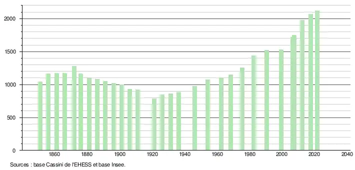 L'évolution du nombre d'habitants est connue à travers les recensements de la population effectués dans la commune depuis 1851. Pour les communes de moins de 10 000 habitants, une enquête de recensement portant sur toute la population est réalisée tous les cinq ans, les populations légales des années intermédiaires étant quant à elles estimées par interpolation ou extrapolation[26]. Pour la commune, le premier recensement exhaustif entrant dans le cadre du nouveau dispositif a été réalisé en 2007[27].