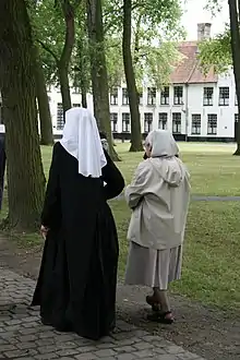 Le terme même de béguine, au départ chargé d’une nuance péjorative, finit par perdre cette connotation pour ne plus désigner, du moins dans les Pays-Bas, que les membres de communautés féminines établies dans des couvents de béguines ou dans des béguinages. Voulant se retirer du monde pour mener une vie pieuse, elles ne faisaient toutefois vœu que de chasteté et d’obéissance, non d’indigence ; au surplus, ces vœux étaient temporaires et prononcés de façon informelle, au contraire des moniales p.ex., dont les vœux était perpétuels et prononcés solennellement. Leur mode de vie était plus libre, et elles pouvaient à tout moment quitter le béguinage et réintégrer le monde, p. ex. pour se marier[2].