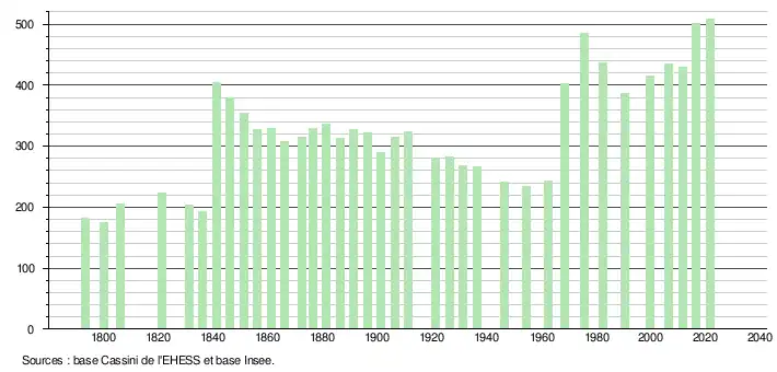 L'évolution du nombre d'habitants est connue à travers les recensements de la population effectués dans la commune depuis 1793. Pour les communes de moins de 10 000 habitants, une enquête de recensement portant sur toute la population est réalisée tous les cinq ans, les populations légales des années intermédiaires étant quant à elles estimées par interpolation ou extrapolation[54]. Pour la commune, le premier recensement exhaustif entrant dans le cadre du nouveau dispositif a été réalisé en 2006[55].