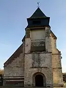 La façade ouest, dans laquelle est ouvert un portail en plein cintre, incorpore une tour-porche fortement contrefortée et surmontée d'un clocher à quatre pans, peu élevé mais de bonnes proportions.
