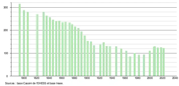 L'évolution du nombre d'habitants est connue à travers les recensements de la population effectués dans la commune depuis 1793. Pour les communes de moins de 10 000 habitants, une enquête de recensement portant sur toute la population est réalisée tous les cinq ans, les populations légales des années intermédiaires étant quant à elles estimées par interpolation ou extrapolation[27]. Pour la commune, le premier recensement exhaustif entrant dans le cadre du nouveau dispositif a été réalisé en 2007[28].