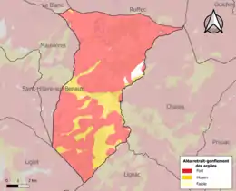 Le retrait-gonflement des sols argileux est susceptible d'engendrer des dommages importants aux bâtiments en cas d’alternance de périodes de sécheresse et de pluie. 98,5 % de la superficie communale est en aléa moyen ou fort (84,7 % au niveau départemental et 48,5 % au niveau national). Sur les 726 bâtiments dénombrés sur la commune en 2019, 708 sont en aléa moyen ou fort, soit 98 %, à comparer aux 86 % au niveau départemental et 54 % au niveau national. Une cartographie de l'exposition du territoire national au retrait gonflement des sols argileux est disponible sur le site du BRGM[21],[22].