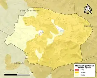 Le retrait-gonflement des sols argileux est susceptible d'engendrer des dommages importants aux bâtiments en cas d’alternance de périodes de sécheresse et de pluie. 77 % de la superficie communale est en aléa moyen ou fort (19,2 % au niveau départemental et 48,5 % au niveau national). Sur les 250 bâtiments dénombrés sur la commune en 2019, 183 sont en aléa moyen ou fort, soit 73 %, à comparer aux 17 % au niveau départemental et 54 % au niveau national. Une cartographie de l'exposition du territoire national au retrait gonflement des sols argileux est disponible sur le site du BRGM[18],[Carte 2].