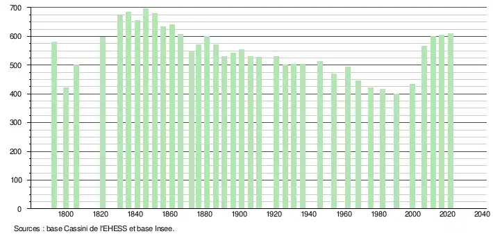 | L'évolution du nombre d'habitants est connue à travers les recensements de la population effectués dans la commune depuis 1793. Pour les communes de moins de 10 000 habitants, une enquête de recensement portant sur toute la population est réalisée tous les cinq ans, les populations légales des années intermédiaires étant quant à elles estimées par interpolation ou extrapolation[20]. Pour la commune, le premier recensement exhaustif entrant dans le cadre du nouveau dispositif a été réalisé en 2006[21]. En 2021, la commune comptait 610 habitants[Note 3], en diminution de 0,16 % par rapport à 2015 (Landes : +4,9 %, France hors Mayotte : +1,84 %). |