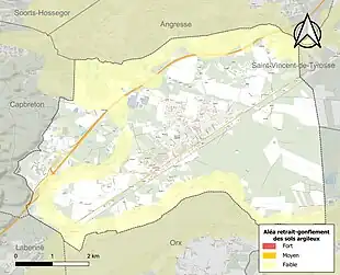 Le retrait-gonflement des sols argileux est susceptible d'engendrer des dommages importants aux bâtiments en cas d’alternance de périodes de sécheresse et de pluie. Aucune partie du territoire de la commune n'est en aléa moyen ou fort (19,2 % au niveau départemental et 48,5 % au niveau national). Sur les 1 249 bâtiments dénombrés sur la commune en 2019, aucun n'est en aléa moyen ou fort, à comparer aux 17 % au niveau départemental et 54 % au niveau national. Une cartographie de l'exposition du territoire national au retrait gonflement des sols argileux est disponible sur le site du BRGM[24],[Carte 2].