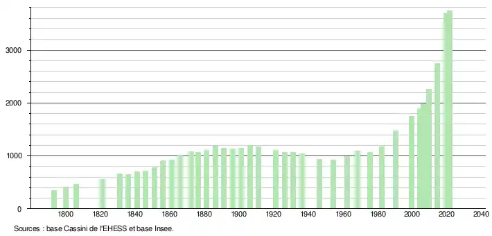 | L'évolution du nombre d'habitants est connue à travers les recensements de la population effectués dans la commune depuis 1793. Pour les communes de moins de 10 000 habitants, une enquête de recensement portant sur toute la population est réalisée tous les cinq ans, les populations légales des années intermédiaires étant quant à elles estimées par interpolation ou extrapolation[28]. Pour la commune, le premier recensement exhaustif entrant dans le cadre du nouveau dispositif a été réalisé en 2004[29]. En 2021, la commune comptait 3 735 habitants[Note 3], en augmentation de 26,91 % par rapport à 2015 (Landes : +4,9 %, France hors Mayotte : +1,84 %). |