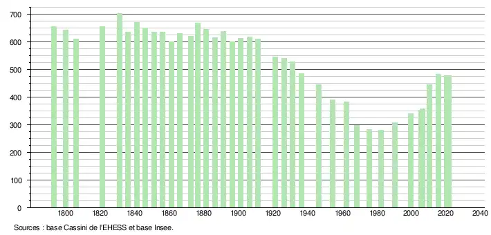 L'évolution du nombre d'habitants est connue à travers les recensements de la population effectués dans la commune depuis 1793. Pour les communes de moins de 10 000 habitants, une enquête de recensement portant sur toute la population est réalisée tous les cinq ans, les populations légales des années intermédiaires étant quant à elles estimées par interpolation ou extrapolation[17]. Pour la commune, le premier recensement exhaustif entrant dans le cadre du nouveau dispositif a été réalisé en 2005[18].