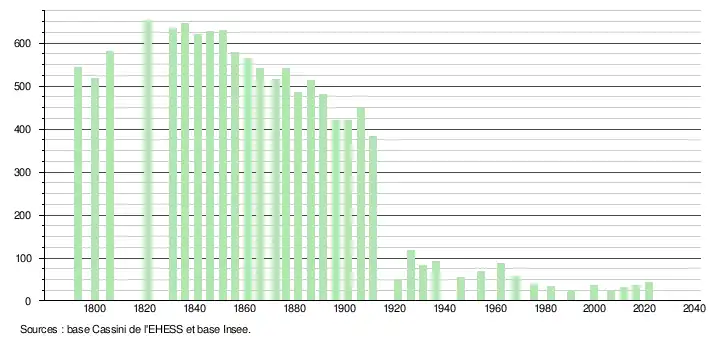 L'évolution du nombre d'habitants est connue à travers les recensements de la population effectués dans la commune depuis 1793. Pour les communes de moins de 10 000 habitants, une enquête de recensement portant sur toute la population est réalisée tous les cinq ans, les populations légales des années intermédiaires étant quant à elles estimées par interpolation ou extrapolation[16]. Pour la commune, le premier recensement exhaustif entrant dans le cadre du nouveau dispositif a été réalisé en 2006[17].