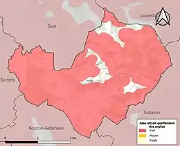 Le retrait-gonflement des sols argileux est susceptible d'engendrer des dommages importants aux bâtiments en cas d’alternance de périodes de sécheresse et de pluie. 91,6 % de la superficie communale est en aléa moyen ou fort (94,5 % au niveau départemental et 48,5 % au niveau national). Sur les 53 bâtiments dénombrés sur la commune en 2019, 39 sont en aléa moyen ou fort, soit 74 %, à comparer aux 93 % au niveau départemental et 54 % au niveau national. Une cartographie de l'exposition du territoire national au retrait gonflement des sols argileux est disponible sur le site du BRGM[21],[Carte 3].