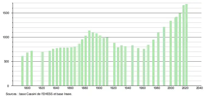 L'évolution du nombre d'habitants est connue à travers les recensements de la population effectués dans la commune depuis 1793. Pour les communes de moins de 10 000 habitants, une enquête de recensement portant sur toute la population est réalisée tous les cinq ans, les populations légales des années intermédiaires étant quant à elles estimées par interpolation ou extrapolation[29]. Pour la commune, le premier recensement exhaustif entrant dans le cadre du nouveau dispositif a été réalisé en 2007[30].