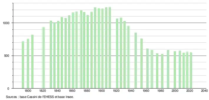 L'évolution du nombre d'habitants est connue à travers les recensements de la population effectués dans la commune depuis 1793. Pour les communes de moins de 10 000 habitants, une enquête de recensement portant sur toute la population est réalisée tous les cinq ans, les populations légales des années intermédiaires étant quant à elles estimées par interpolation ou extrapolation[24]. Pour la commune, le premier recensement exhaustif entrant dans le cadre du nouveau dispositif a été réalisé en 2006[25].