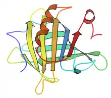La β-lactoglobuline est une albumine de 18,36 kDa, qui se présente sous la forme d'un dimére à pH entre 3 et 7. Il en existe plusieurs variants.
