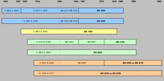 Les E 4000 et E 4500 ont fait l'objet de modifications croisées avant de devenir en phase finale respectivement BB 1500 et BB 1600 à la SNCF[2].