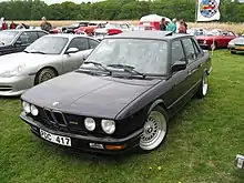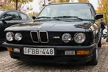 À peu près au même moment que la M535i, M-Motorsport GmbH a présenté la première BMW M5. Elle a le code d'usine E28S et elle était fabriquée à la main[31]. La caractéristique la plus importante parmi de nombreux changements plus ou moins mineurs apportés aux berlines E28 "normales" était la motorisation avec le moteur appelé M88/3 en interne, qui était également utilisé dans la M635CSi (également un produit de BMW Motorsport GmbH) et qui avait été développé à l'origine pour la voiture de sport M1. Ce moteur six cylindres, qui, dans l'E28S allemande, n'était disponible que sans convertisseur catalytique à commande lambda, contrairement à la M635CSi, dispose de quatre soupapes par cylindre et de six manettes de gaz individuels. Elle a une cylindrée de 3,5 litres et délivre 210 kW (286 ch). À l'été 1985, la M5 est entrée en production de série. Cependant, le marché de vente le plus important pour la première BMW M5 était le marché nord-américain, 1 340 des 2 241 BMW M5 E28S construites y ont été vendues, ce qui correspond à une part d'environ 60 %. Pour cette raison, un modèle spécial pour le marché nord-américain a été développé pour la première M5 afin de répondre aux exigences des clients là-bas; comme les autres modèles d’E28 pour le marché nord-américain, elle a des pare-chocs modifiés. La production du modèle nord-américain a commencé en 1986[32]. Contrairement au modèle allemand, le modèle nord-américain dispose d'un convertisseur catalytique d'échappement, avec lequel le moteur produit 191 kW. Ce moteur est appelé S38B35, mais il est techniquement basé sur le moteur M88 utilisé dans le modèle allemand[33]. La maniabilité de l'E28S était considérée comme impressionnante dans les années 1980[31].