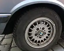 Des roues à jante en acier et des roues à jante en alliage étaient disponibles d’usine pour l’E28. La dimension d’une roue standard est de 6 J x 14 H2. Des roues plus larges ou plus étroites d’un demi-pouce (12,7 mm) conviennent également. Le déport de roue est de +22 mm pour toutes les roues. Initialement, les roues à jante en acier avec la plus petite largeur de jante (5½ J x 14 H2) étaient standard, les roues plus grandes étaient soumises à un supplément[66]. Les roues plus grandes sont ensuite devenues la norme. L’E28 est disponible en versions conduite à gauche et conduite à droite. La direction standard est soit une direction à recirculation de billes ZF (direction à écrou sphérique) avec effet direction assistée dépendant de la vitesse, soit une direction Gemmer de ZF avec vis sans fin globoïde et rouleau denté (direction à vis sans fin) sur les 518 et 518i[26],[67].