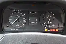 Instruments d’une 525e. Les E28 avec ABS ont un autocollant ABS au-dessus des jauges et un voyant ABS jaune (cinquième à partir de la droite)