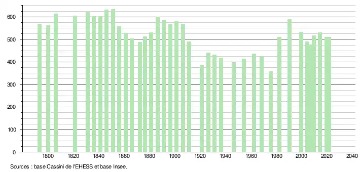 L'évolution du nombre d'habitants est connue à travers les recensements de la population effectués dans la commune depuis 1793. Pour les communes de moins de 10 000 habitants, une enquête de recensement portant sur toute la population est réalisée tous les cinq ans, les populations légales des années intermédiaires étant quant à elles estimées par interpolation ou extrapolation[20]. Pour la commune, le premier recensement exhaustif entrant dans le cadre du nouveau dispositif a été réalisé en 2004[21].