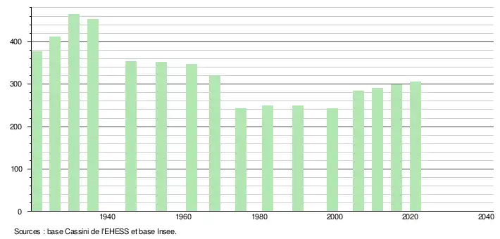 L'évolution du nombre d'habitants est connue à travers les recensements de la population effectués dans la commune depuis 1921. Pour les communes de moins de 10 000 habitants, une enquête de recensement portant sur toute la population est réalisée tous les cinq ans, les populations légales des années intermédiaires étant quant à elles estimées par interpolation ou extrapolation[29]. Pour la commune, le premier recensement exhaustif entrant dans le cadre du nouveau dispositif a été réalisé en 2006[30].