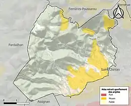 Le retrait-gonflement des sols argileux est susceptible d'engendrer des dommages importants aux bâtiments en cas d’alternance de périodes de sécheresse et de pluie. 18 % de la superficie communale est en aléa moyen ou fort (59,3 % au niveau départemental et 48,5 % au niveau national). Sur les 237 bâtiments dénombrés sur la commune en 2019, 183 sont en aléa moyen ou fort, soit 77 %, à comparer aux 85 % au niveau départemental et 54 % au niveau national. Une cartographie de l'exposition du territoire national au retrait gonflement des sols argileux est disponible sur le site du BRGM[21],[Carte 2].
