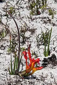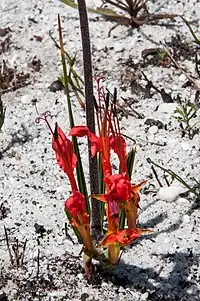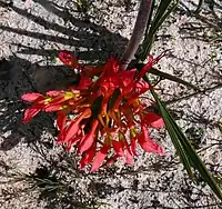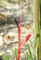 Son feuillage est long et dressé avec une inflorescence constituée d'une tige principale stérile adaptée à l'ornithophilie, pollinisation par les oiseaux. La plante porte des fleurs tubulaires rouge vif sur des branches latérales proches du sol. C'est une plante vivace qui pousse dans un sol sableux pauvre en nutriments[4] et fleurit pendant les pluies hivernales[5].
