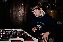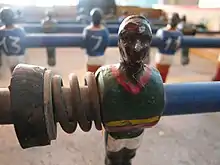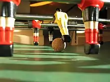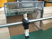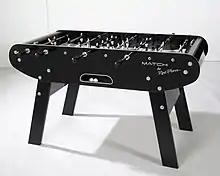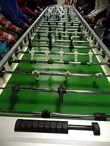 Le baby-foot ou babyfoot (en France[1], en Suisse et au Canada ; faux anglicisme), soccer sur/de table ou football sur/de table[2] (au Canada), kicker (en Belgique) ou encore foot-foot (en Suisse) et officiellement dénommé football de table par la fédération française[3], est un jeu simulant une partie de football sur une table et opposant généralement deux équipes de deux joueurs ou un joueur à un autre. La table, nommée elle aussi baby-foot, est constituée d'un plateau représentant le terrain, au-dessus et en travers duquel se déplacent huit barres qui supportent les onze figurines de chaque équipe appelées joueurs. Chaque côté peut ainsi actionner quatre barres :