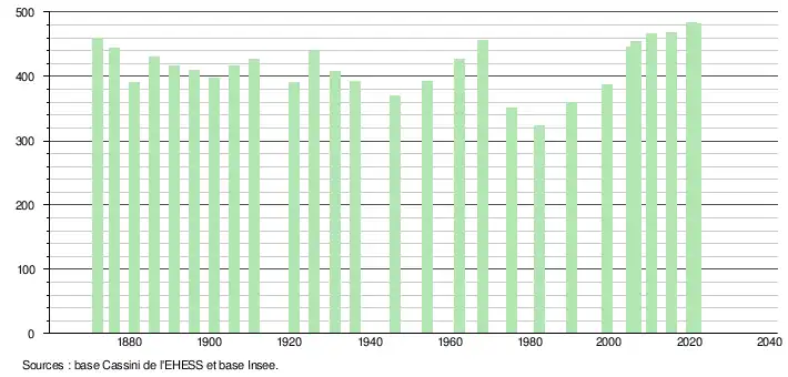 L'évolution du nombre d'habitants est connue à travers les recensements de la population effectués dans la commune depuis 1872. Pour les communes de moins de 10 000 habitants, une enquête de recensement portant sur toute la population est réalisée tous les cinq ans, les populations légales des années intermédiaires étant quant à elles estimées par interpolation ou extrapolation[36]. Pour la commune, le premier recensement exhaustif entrant dans le cadre du nouveau dispositif a été réalisé en 2005[37].