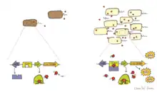 Un exemple bien connu de quorum sensing se produit entre Aliivibrio fischeri et son hôte. Ce processus est régulé par deux gènes, LuxI et LuxR. LuxI code pour une synthase autoinductrice qui produit une molécule autoinductrice (AI), tandis que LuxR agit à la fois comme un récepteur et un facteur de transcription pour l'opéron lux[4]. Lorsque LuxR se lie à AI, le complexe LuxR-AI active la transcription de l'opéron lux, ce qui conduit à l'expression de la luciférase[28]. Grâce à ce système, A. fischeri n'émet de lumière que lorsqu'il est en association avec son hôte et que la densité cellulaire atteint un seuil suffisant[29].