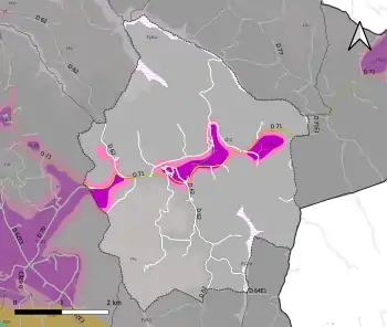 L'occupation des sols de la commune, telle qu'elle ressort de la base de données européenne d’occupation biophysique des sols Corine Land Cover (CLC), est marquée par l'importance des territoires agricoles (67 % en 2018), une proportion identique à celle de 1990 (67,2 %). La répartition détaillée en 2018 est la suivante : zones agricoles hétérogènes (42,4 %), forêts (31,7 %), prairies (20,5 %), cultures permanentes (4,1 %), zones urbanisées (1,3 %)[35]. L'évolution de l’occupation des sols de la commune et de ses infrastructures peut être observée sur les différentes représentations cartographiques du territoire : la carte de Cassini (XVIIIe siècle), la carte d'état-major (1820-1866) et les cartes ou photos aériennes de l'IGN pour la période actuelle (1950 à aujourd'hui)[Carte 3].