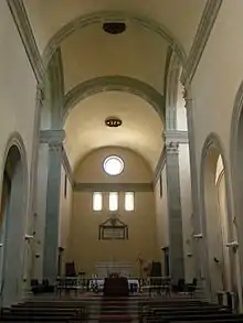 À l'intérieur, l'église ressemble à un grand et spacieux temple de style Renaissance avec un plan en croix latine. La nef centrale est séparée des deux bas-côtés, plus petits en hauteur et en largeur que le central, par quatre arcs soutenus par des piliers de chaque côté. Une élégante voûte d'ogives émerge à l'intersection des quatre voûtes en berceau de la nef, du transept et de l'abside, avec le blason de la Maison de Médicis au centre, également visible dans la voûte de l'abside.