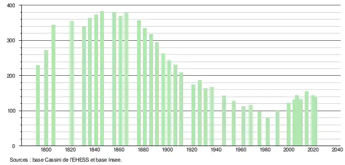 L'évolution du nombre d'habitants est connue à travers les recensements de la population effectués dans la commune depuis 1793. Pour les communes de moins de 10 000 habitants, une enquête de recensement portant sur toute la population est réalisée tous les cinq ans, les populations légales des années intermédiaires étant quant à elles estimées par interpolation ou extrapolation[24]. Pour la commune, le premier recensement exhaustif entrant dans le cadre du nouveau dispositif a été réalisé en 2004[25].