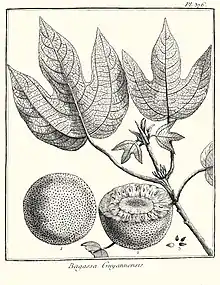 Arbor craſſiſſima, altiſſima, rami numeroſi. Folia oppoſita, ampla, trilobata, integerrima, lobis acutis. Stipulæ utrinque binæ, oblongæ, membranaceæ, deciduæ. Fructus aurantii formâ. Bacca naveſcens, cortice membranaceo granulato, intiis carnoſa, ſub cortice pulpoſa. Semina plurima, ovato-acuta, pulpa obvoluta.