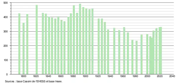 L'évolution du nombre d'habitants est connue à travers les recensements de la population effectués dans la commune depuis 1793. Pour les communes de moins de 10 000 habitants, une enquête de recensement portant sur toute la population est réalisée tous les cinq ans, les populations légales des années intermédiaires étant quant à elles estimées par interpolation ou extrapolation[22]. Pour la commune, le premier recensement exhaustif entrant dans le cadre du nouveau dispositif a été réalisé en 2004[23].