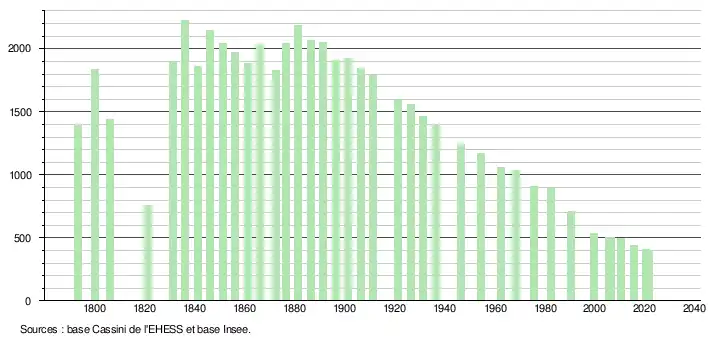 L'évolution du nombre d'habitants est connue à travers les recensements de la population effectués dans la commune depuis 1793. Pour les communes de moins de 10 000 habitants, une enquête de recensement portant sur toute la population est réalisée tous les cinq ans, les populations légales des années intermédiaires étant quant à elles estimées par interpolation ou extrapolation[24]. Pour la commune, le premier recensement exhaustif entrant dans le cadre du nouveau dispositif a été réalisé en 2005[25].
