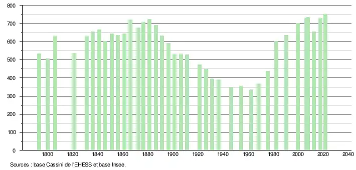 L'évolution du nombre d'habitants est connue à travers les recensements de la population effectués dans la commune depuis 1793. Pour les communes de moins de 10 000 habitants, une enquête de recensement portant sur toute la population est réalisée tous les cinq ans, les populations légales des années intermédiaires étant quant à elles estimées par interpolation ou extrapolation[18]. Pour la commune, le premier recensement exhaustif entrant dans le cadre du nouveau dispositif a été réalisé en 2007[19].
