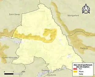 Le retrait-gonflement des sols argileux est susceptible d'engendrer des dommages importants aux bâtiments en cas d’alternance de périodes de sécheresse et de pluie. 10,8 % de la superficie communale est en aléa moyen ou fort (19,2 % au niveau départemental et 48,5 % au niveau national). Sur les 264 bâtiments dénombrés sur la commune en 2019, 23 sont en aléa moyen ou fort, soit 9 %, à comparer aux 17 % au niveau départemental et 54 % au niveau national. Une cartographie de l'exposition du territoire national au retrait gonflement des sols argileux est disponible sur le site du BRGM[21],[Carte 2].