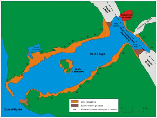 Les traces du passage de l'eau seront observées jusqu'à une altitude de 524 ou 525 mètres[4],[5], faisant de ce tsunami l'un des plus hauts jamais observés[4]. Toutefois, cette caractéristique est à modérer du fait que ce n'est pas la vague en elle-même qui mesurait 525 mètres de hauteur mais son déferlement, ce qui peut sensiblement fausser les mesures. La vague, d'une hauteur estimée à 60 mètres[5], poursuivant son parcours, traverse la baie dans sa longueur en occasionnant le même type de dégâts tout le long du rivage mais jusqu'à une altitude inférieure, l'énergie du tsunami se dissipant au fur et à mesure de son avancée en raison de l'élargissement de la baie et de la présence de l'île en son centre[4]. Arrivant au détroit qui fait communiquer la baie avec l'océan Pacifique, la vague ne parvient pas à franchir significativement les hauts-fonds et le tsunami ne s'étend pas à l'océan[4]. Les dégâts sont surtout représentés par l'arrachement de la végétation le long du rivage et le décapage du sol. Mouillés à côté de l'île du Cénotaphe, trois bateaux de pêche sont emportés par l'énorme vague[1], tuant deux[4] à cinq personnes. L'un des bateaux a été retrouvé vide dans la baie, et un autre a totalement disparu ; le troisième, occupé par un père et son fils, est passé au-dessus de l'île du Cénotaphe, a été emporté dans l'océan puis, lors du reflux, est revenu à l'intérieur de la baie[1] :